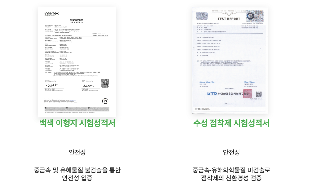 백색이형지와 수성점착제 모두 중금속 및 유해화학물질 ‘미검출’ 판정을 받았습니다.