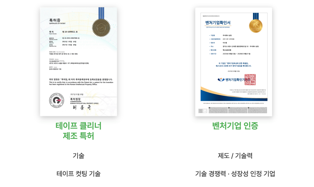 제조 특허, 벤처기업 인증을 통해 기술 혁신성과 성장 잠재력을 인정받았습니다.